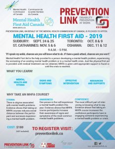 Prevention Link is thrilled to offer this two-day course gives participants the skills to provide assistance to a person developing a mental health problem or experiencing a mental health crisis. Just as physical first aid is administered to an injured person before medical treatment can be offered or until the crisis is resolved. **Participants must be present for the full length of the course in order to be certified.