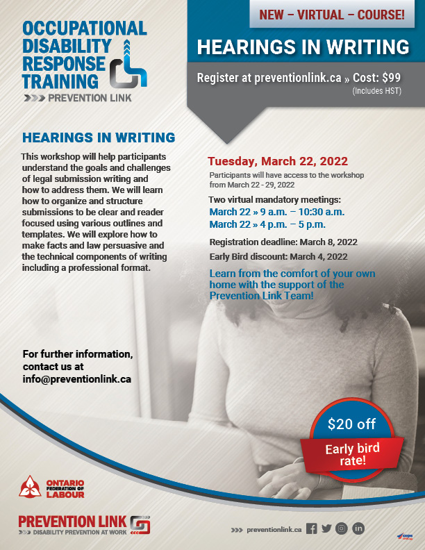 This workshop will help participants understand the goals and challenges of legal submission writing and how to address them. In accordance with the WSIB’s Practice and Procedures and with WSIAT’s Practice Directions, participants will learn how to organize and structure submissions to be clear and reader focused. Using various outlines and templates, the traditional structure of a submission is examined with attention given to strategies and guidelines to produce an effective written hearing submission. Participants will explore making facts and law persuasive and the technical components of writing, including referring to and attaching documents and a professional format will be reviewed.
