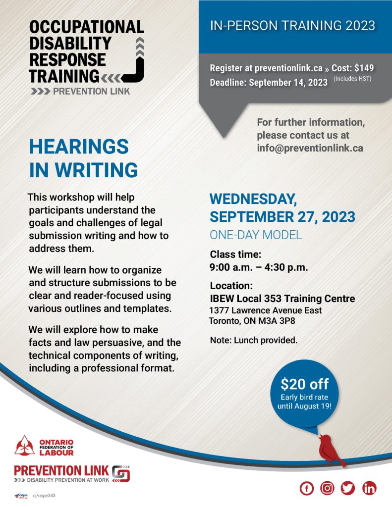 This workshop will help participants understand the goals and challenges of legal submission writing and how to address them. In accordance with the WSIB’s Practice and Procedures and with WSIAT’s Practice Directions, participants will learn how to organize and structure submissions to be clear and reader focused. Using various outlines and templates, the traditional structure of a submission is examined with attention given to strategies and guidelines to produce an effective written hearing submission. Participants will explore making facts and law persuasive, and the technical components of writing, including referring to and attaching documents and a professional format will be reviewed.