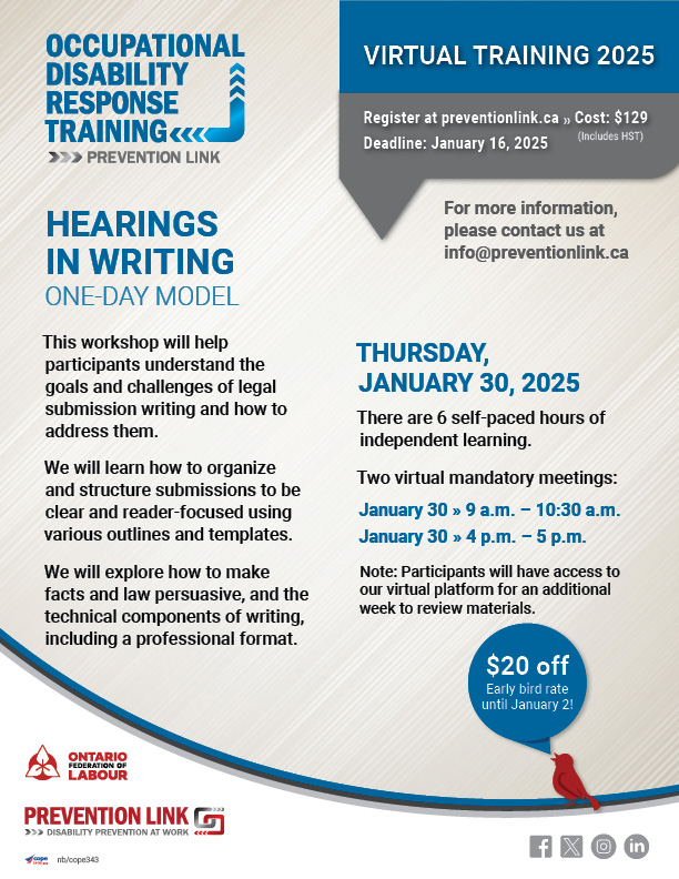 This workshop will help participants understand the goals and challenges of legal submission writing and how to address them. In accordance with the WSIB’s Practice and Procedures and with WSIAT’s Practice Directions, participants will learn how to organize and structure submissions to be clear and reader focused. Using various outlines and templates, the traditional structure of a submission is examined with attention given to strategies and guidelines to produce an effective written hearing submission. Participants will explore making facts and law persuasive and the technical components of writing, including referring to and attaching documents and a professional format will be reviewed.