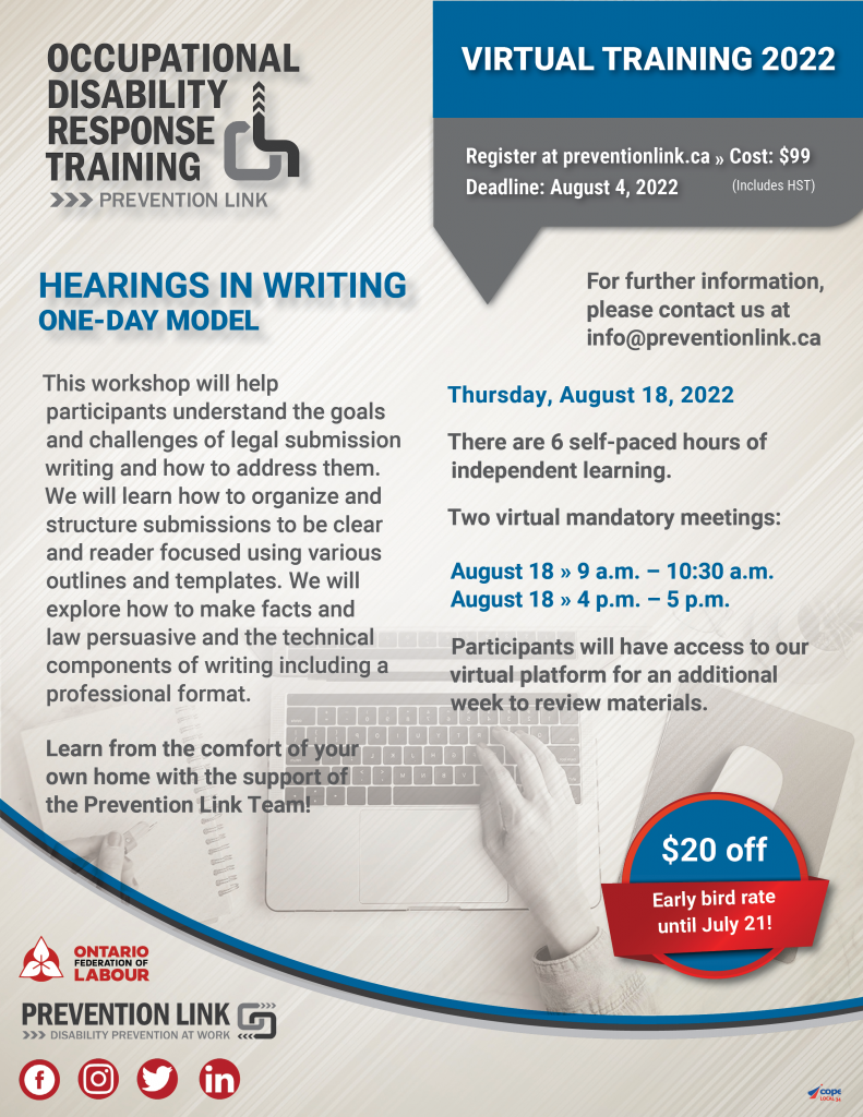 This workshop will help participants understand the goals and challenges of legal submission writing and how to address them. In accordance with the WSIB’s Practice and Procedures and with WSIAT’s Practice Directions, participants will learn how to organize and structure submissions to be clear and reader focused. Using various outlines and templates, the traditional structure of a submission is examined with attention given to strategies and guidelines to produce an effective written hearing submission. Participants will explore making facts and law persuasive and the technical components of writing, including referring to and attaching documents and a professional format will be reviewed.
