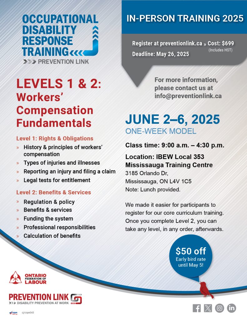 Levels 1 and 2 are foundation courses that teach participants the workers’ compensation system in Ontario (WSIB). They learn about the principles of workers’ compensation, how to report and file a WSIB claim, types of injuries, regulations and policies, benefits and services, and much more.