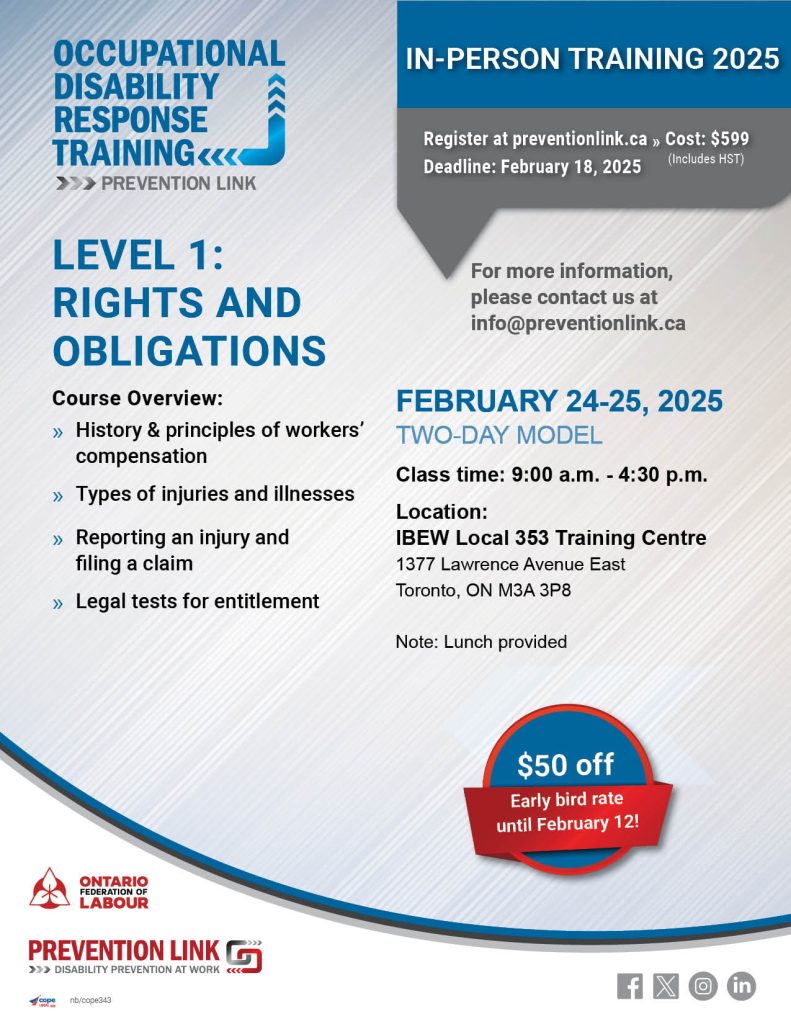 Explore your rights & obligations under the Workplace Safety and Insurance Act. The two-day model is filled with presentations, videos, and discussions. Who should attend: WSIB representatives, Workers’ Compensation activists, RTW specialists, union leadership and union stewards, H&S representatives and activists, supervisors and employers, and young workers.