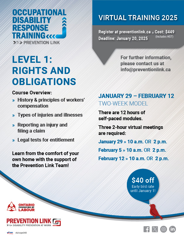 Explore your rights & obligations under the Workplace Safety and Insurance Act. There are 12 hours of self-paced modules, with presentations, videos, discussions, quizzes, and the Prevention Link team to support you in making this essential online training very interesting. Who should attend: WSIB representatives, Workers’ Compensation activists, RTW specialists, union leadership and union stewards, H&S representatives and activists, supervisors and employers, and young workers.