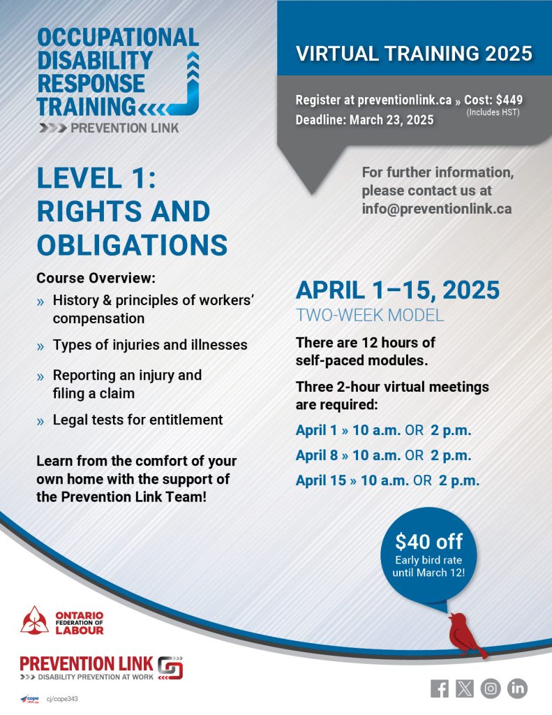 Explore your rights & obligations under the Workplace Safety and Insurance Act. There are 12 hours of self-paced modules, with presentations, videos, discussions, quizzes, and the Prevention Link team to support you in making this essential online training very interesting. Who should attend: WSIB representatives, Workers’ Compensation activists, RTW specialists, union leadership and union stewards, H&S representatives and activists, supervisors and employers, and young workers.