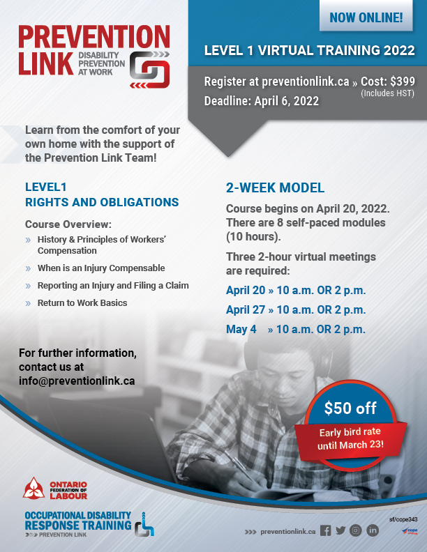 Explore your rights & obligations under the Workplace Safety and Insurance Act. There are 8 self-paced modules (10 hours), with presentations, videos, discussions, quizzes and Prevention Link team there to support you to make this important online training very interesting. Who should attend: WSIB representatives, Workers’ Compensation activists, RTW specialists, union leadership and union stewards, H&S representatives and activists, supervisors and employers, young workers.