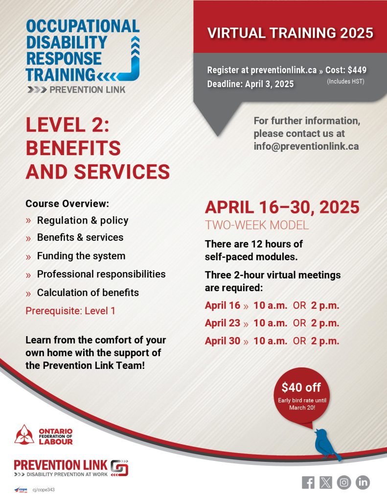 Explore your benefits & services under the Workplace Safety and Insurance Act. There are 12 hours of self-paced modules, which include presentations, videos, and discussions, and our Prevention Link team will be there to support you in making this important online training valuable and engaging. Who should attend: WSIB representatives, Workers’ Compensation activists, RTW specialists, union leadership and union stewards, H&S representatives and activists, supervisors and employers, and young workers.
