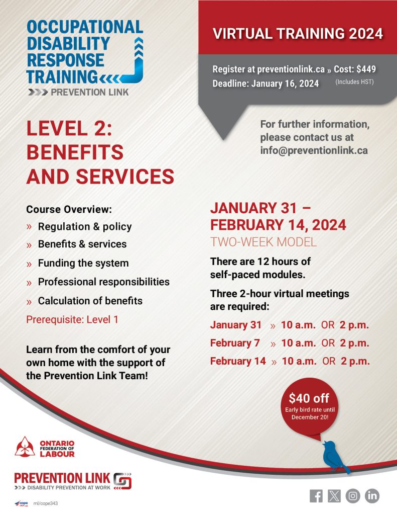 Explore your benefits & services under the Workplace Safety and Insurance Act. There are 12 hours of self-paced modules, which include presentations, videos, discussions, and our Prevention Link team will be there to support you in making this important online training valuable and engaging. Who should attend: WSIB representatives, Workers’ Compensation activists, RTW specialists, union leadership and union stewards, H&S representatives and activists, supervisors and employers, young workers.