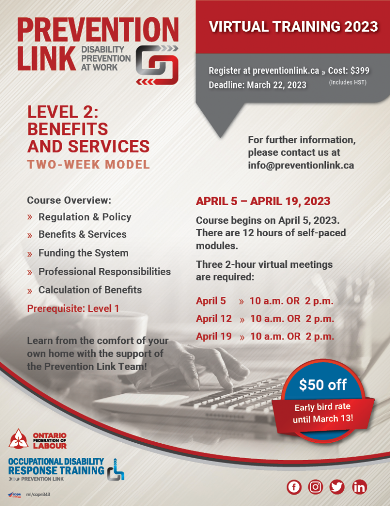 Explore your benefits & services under the Workplace Safety and Insurance Act. There are 12 hours of self-paced modules, which include presentations, videos, discussions, and our Prevention Link team will be there to support you in making this important online training valuable and engaging. Who should attend: WSIB representatives, Workers’ Compensation activists, RTW specialists, union leadership and union stewards, H&S representatives and activists, supervisors and employers, young workers.