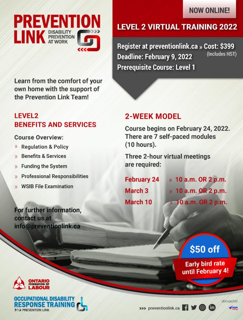Explore your benefits & services under the Workplace Safety and Insurance Act. Seven self-paced modules (10 hours) include presentations, videos, discussions, and our Prevention Link team will be there to support you in making this important online training valuable and engaging. Who should attend: WSIB representatives, Workers’ Compensation activists, RTW specialists, union leadership and union stewards, H&S representatives and activists, supervisors and employers, young workers.