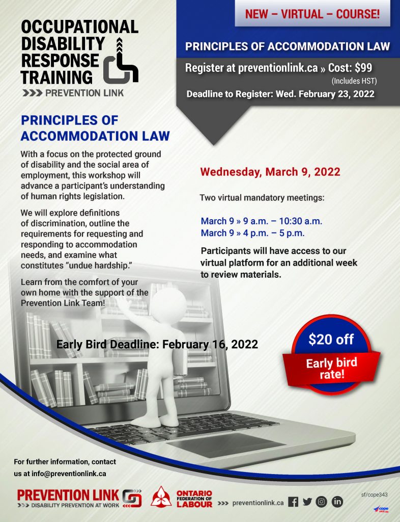With a focus on the protected ground of disability and the social area of employment, this workshop will advance a participant’s understanding of human rights legislation. We will explore definitions of discrimination, outline the requirements for requesting and responding to accommodation needs, and examine what constitutes “undue hardship.”