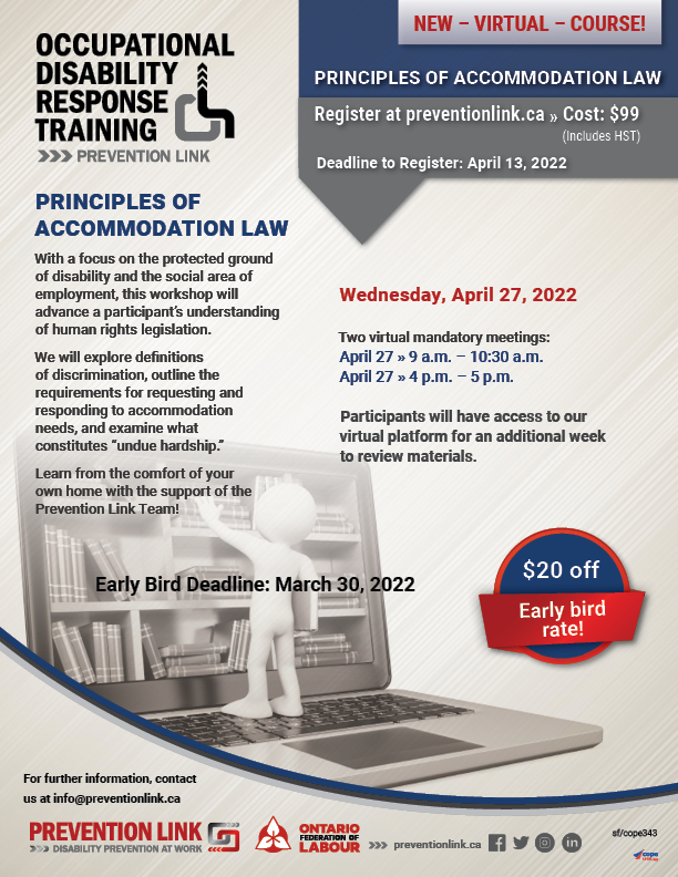 With a focus on the protected ground of disability and the social area of employment, this workshop will advance a participant’s understanding of human rights legislation. We will explore definitions of discrimination, outline the requirements for requesting and responding to accommodation needs, and examine what constitutes “undue hardship.”