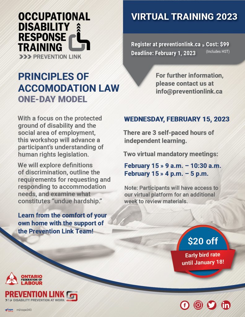With a focus on the protected ground of disability and the social area of employment, this workshop will advance a participant’s understanding of human rights legislation. We will explore definitions of discrimination, outline the requirements for requesting and responding to accommodation needs, and examine what constitutes “undue hardship.”