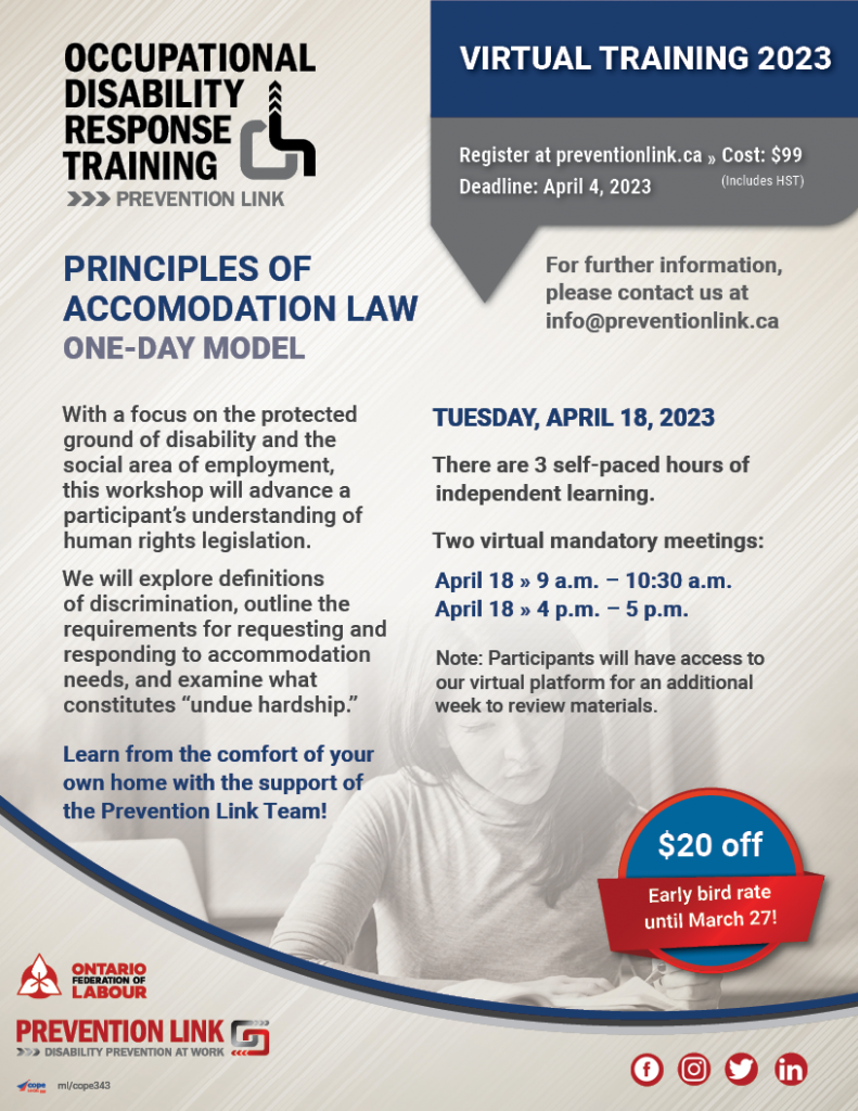 With a focus on the protected ground of disability and the social area of employment, this workshop will advance a participant’s understanding of human rights legislation. We will explore definitions of discrimination, outline the requirements for requesting and responding to accommodation needs, and examine what constitutes “undue hardship.”