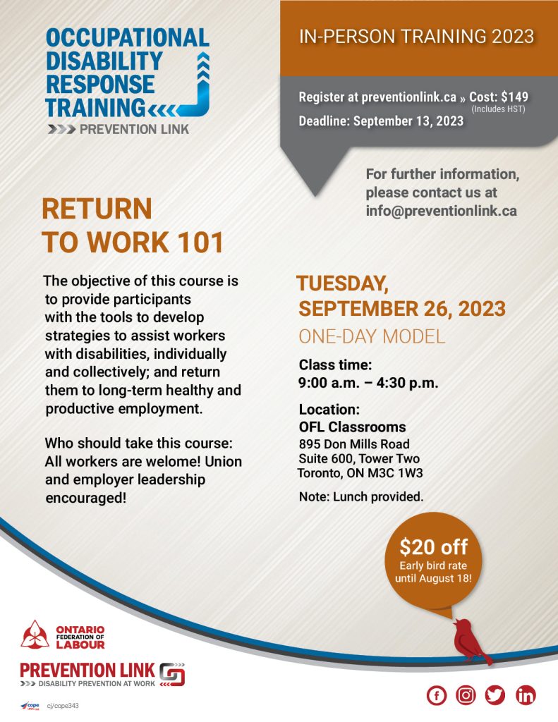 The objective of this course is to provide participants with the tools to develop strategies to assist workers with disabilities, individually and collectively; and return them to long-term healthy and productive employment. The course will review noteworthy case law and Human Rights legislation. Who should take this course: All workers are welcome! Union and employer leadership encouraged!