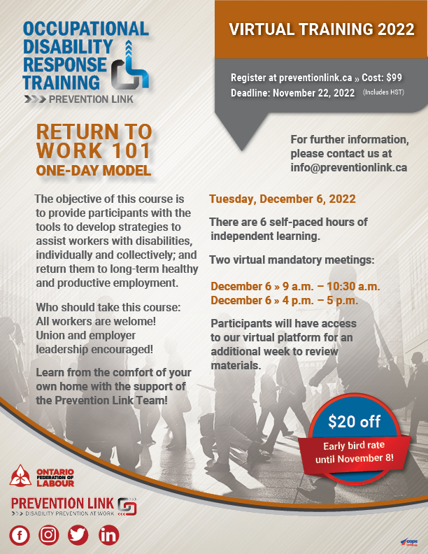 The objective of this course is to provide participants with the tools to develop strategies to assist workers with disabilities, individually and collectively; and return them to long-term healthy and productive employment. The course will review noteworthy case law and Human Rights legislation. Who should take this course: All workers are welcome! Union and employer leadership encouraged!