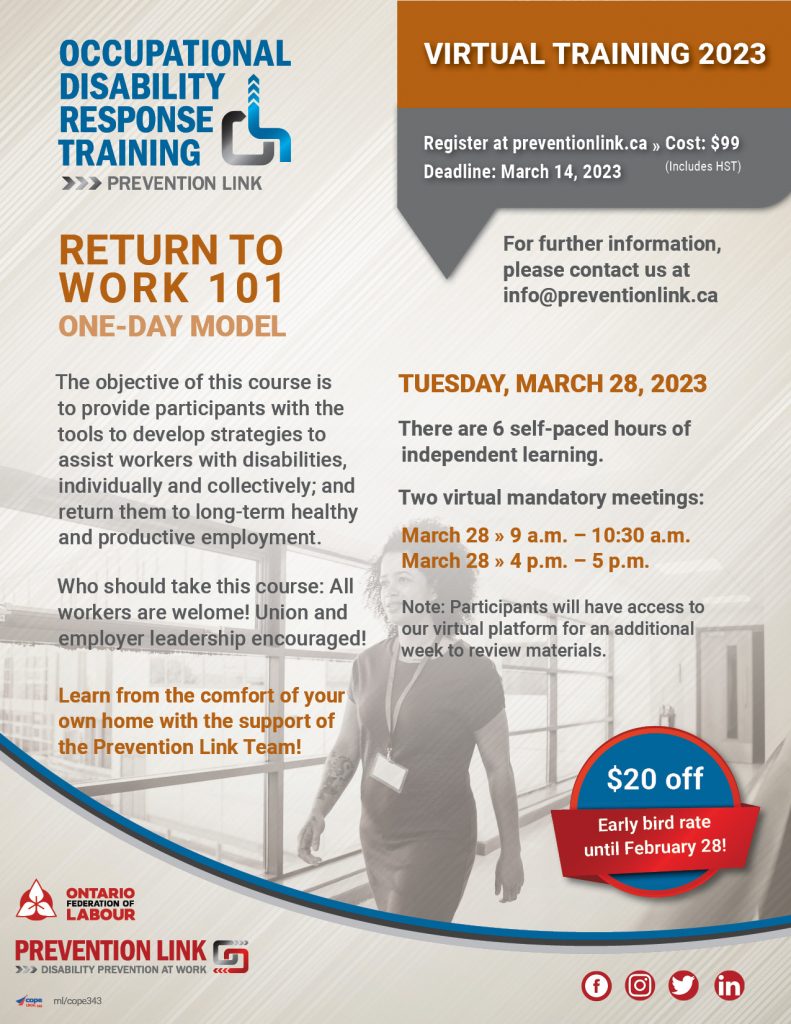 The objective of this course is to provide participants with the tools to develop strategies to assist workers with disabilities, individually and collectively; and return them to long-term healthy and productive employment. The course will review noteworthy case law and Human Rights legislation. Who should take this course: All workers are welcome! Union and employer leadership encouraged!