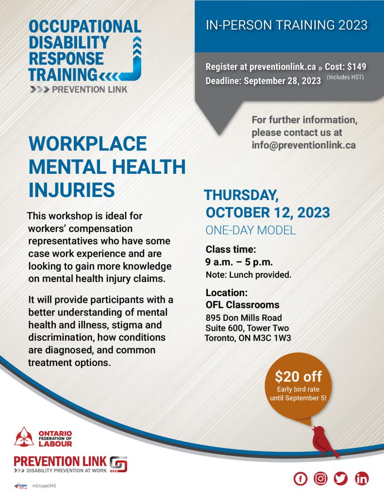Prevention Link’s Workplace Mental Health Injuries workshop is ideal for workers’ compensation representatives who have some case work experience and are looking to gain more knowledge on mental health injury claims.