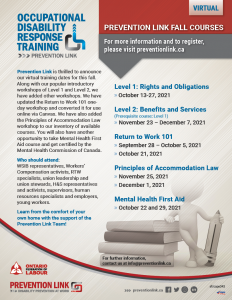 Prevention Link is thrilled to announce our virtual training dates for this fall. Along with our popular introductory workshops of Level 1 and Level 2, we have added other workshops. We have updated the Return to Work 101 one-day workshop and converted it for use online via Canvas. We have also added the Principles of Accommodation Law workshop to our inventory of available courses. You will also have another opportunity to take Mental Health First Aid course and get certified by the Mental Health Commission of Canada.