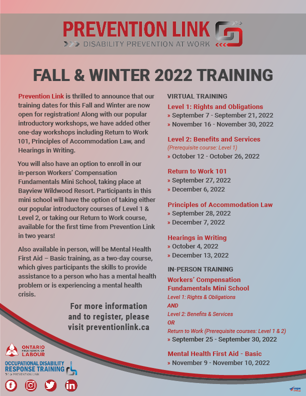 Prevention Link is thrilled to announce that our training dates for this Fall and Winter are now open for registration! Along with our popular introductory workshops, we have added other one-day workshops including Return to Work 101, Principles of Accommodation Law, and Hearings in Writing.