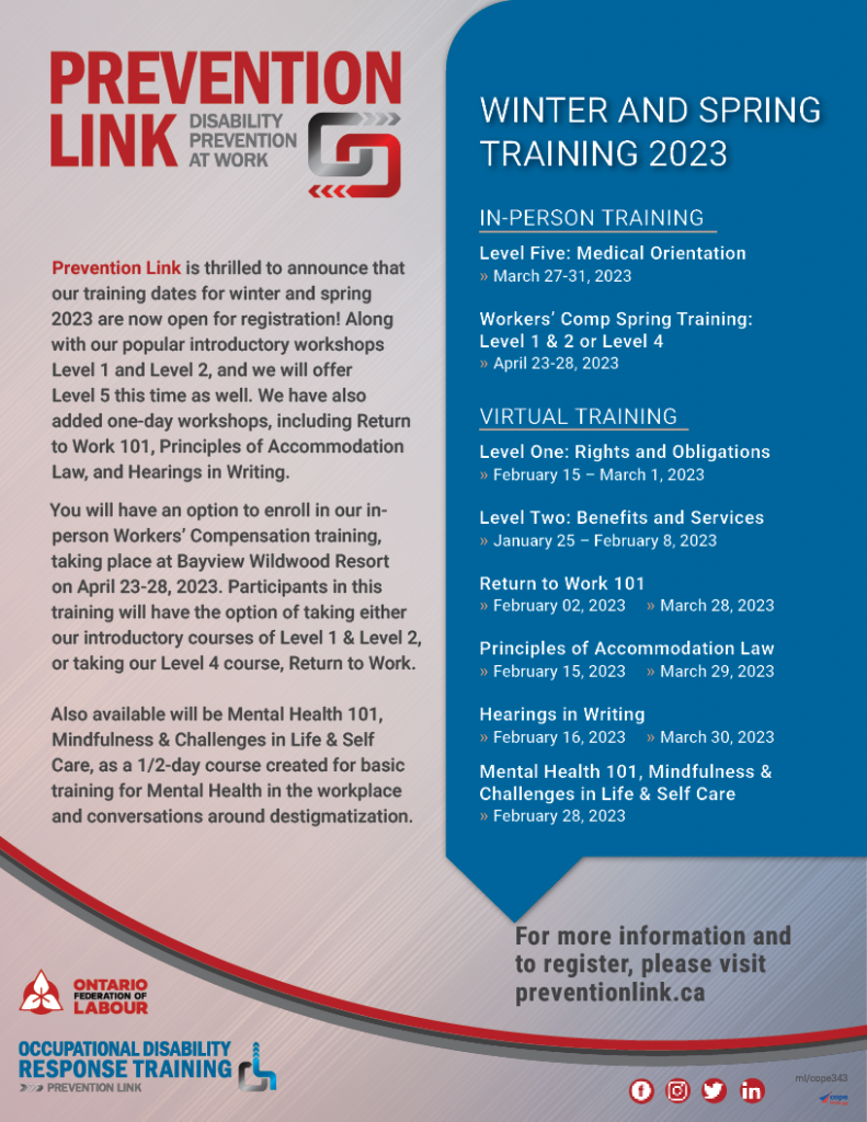 Prevention Link is thrilled to announce that our training dates for winter and spring 2023 are now open for registration! Along with our popular introductory workshops Level 1 and Level 2, we offer Level 5 this time (please look carefully what prerequisites are). We have also added one-day workshops, including Return to Work 101, Principles of Accommodation Law, and Hearings in Writing.