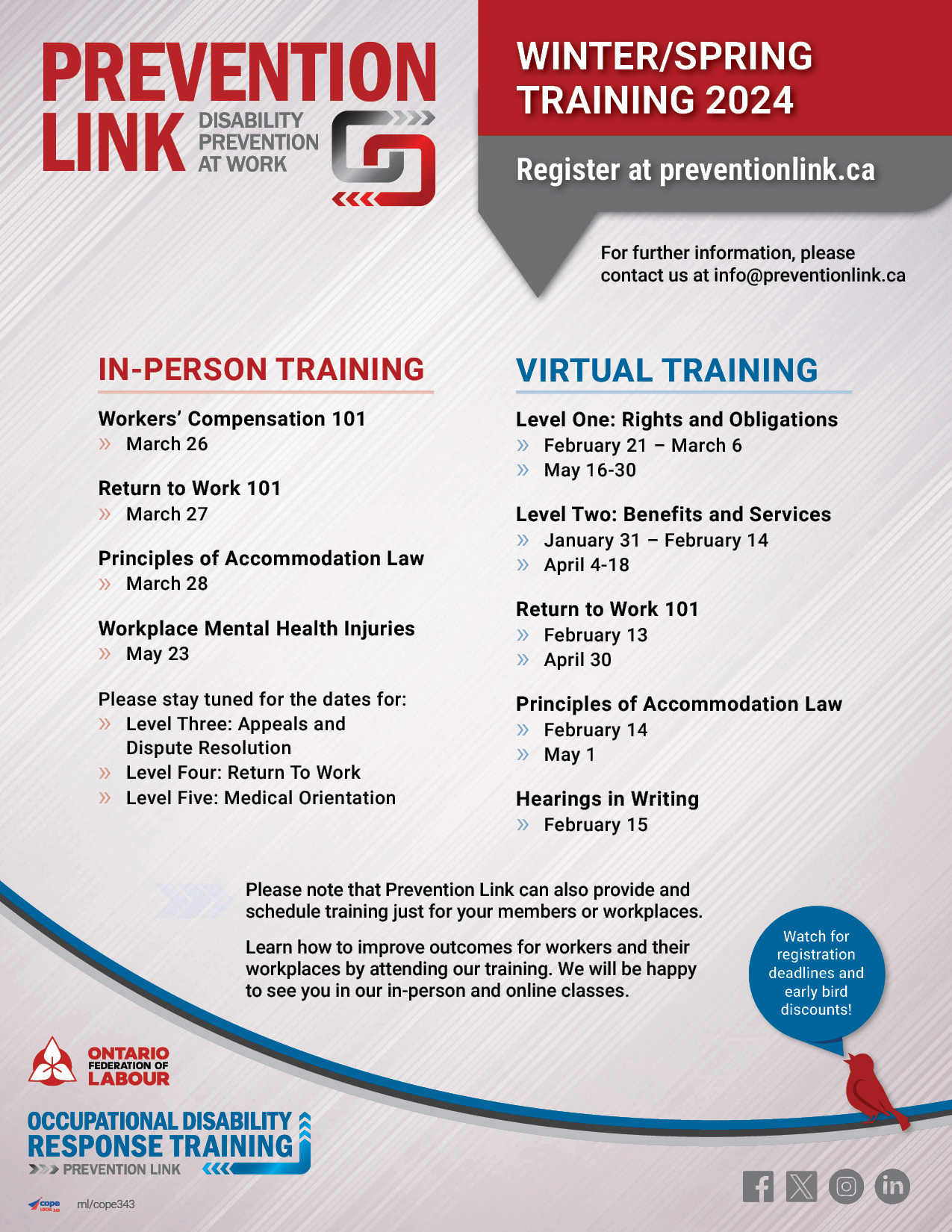Please note that Prevention Link can also provide and schedule training just for your members or workplaces!